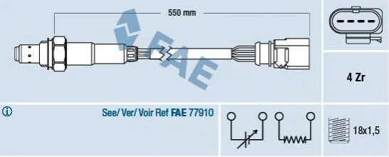 Лямбда-зонд (кількість дротів 4, 550мм) AUDI A3, A6 ALLROAD C7, A6 C7, A7, A8 D4, SEAT ALTEA, ALTEA XL, CORDOBA, IBIZA III, IBIZA IV, IBIZA IV SC, LEON, TOLEDO III 1.4-3.0 05.03-09.18 FAE 77439